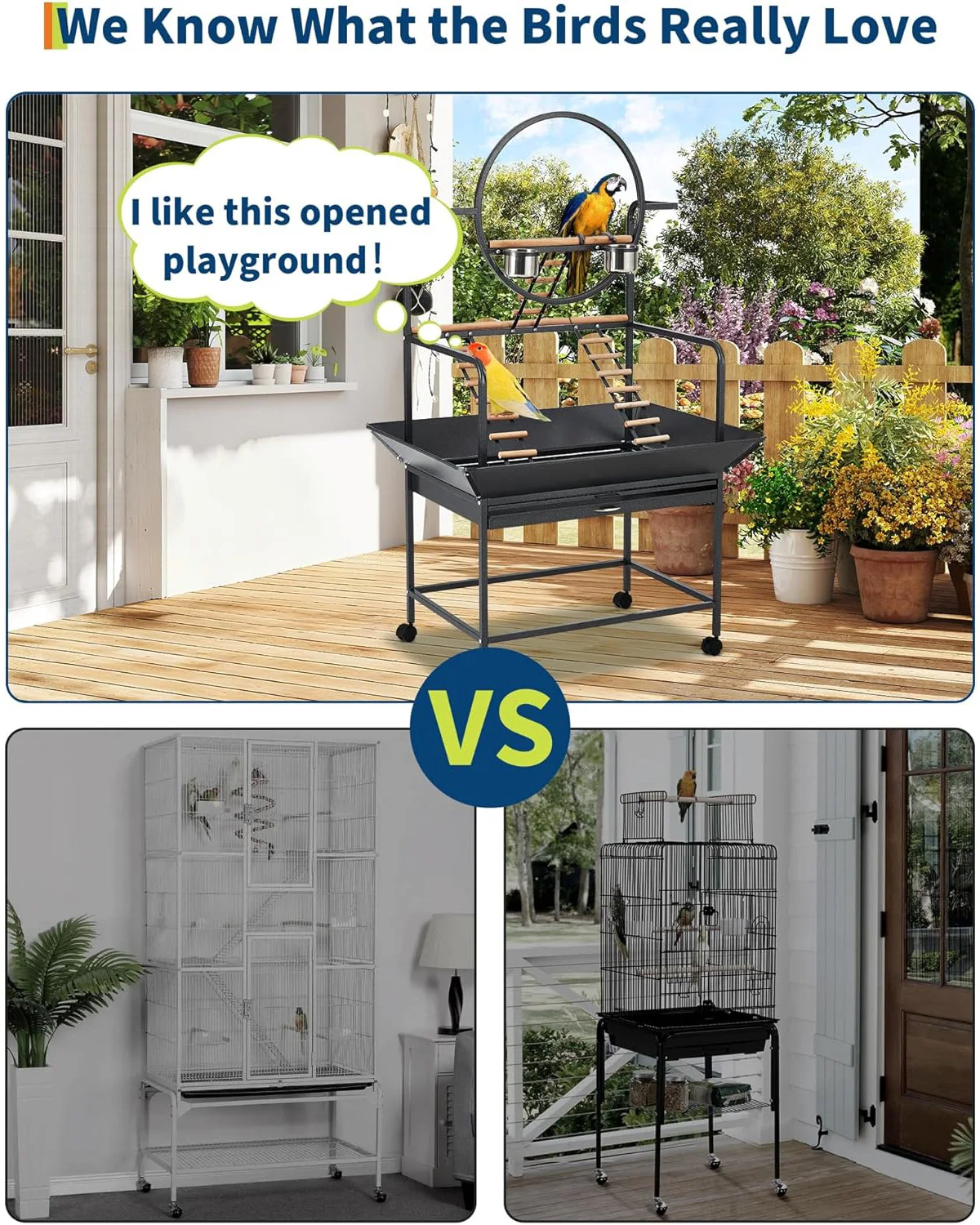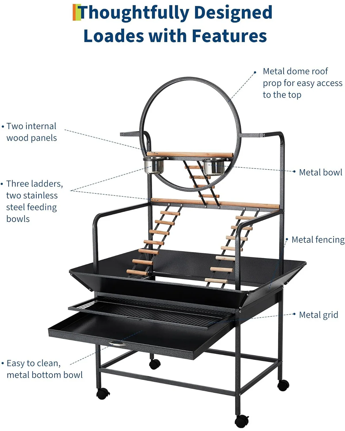 - Enrichment-focused layout with 3 textured perches, angled ladders, and toy hooks ensures beak exercise, mental stimulation, and ongoing activity.