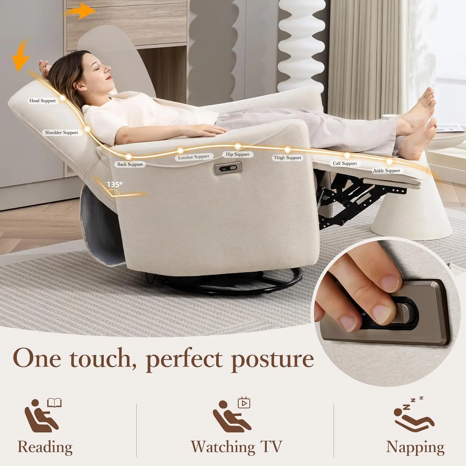 Experience effortless lounging with the XIAOLANG Power Swivel Recliner Chair Upholstered Fabric Glider, your go-to for comfort, versatility, and modern style.